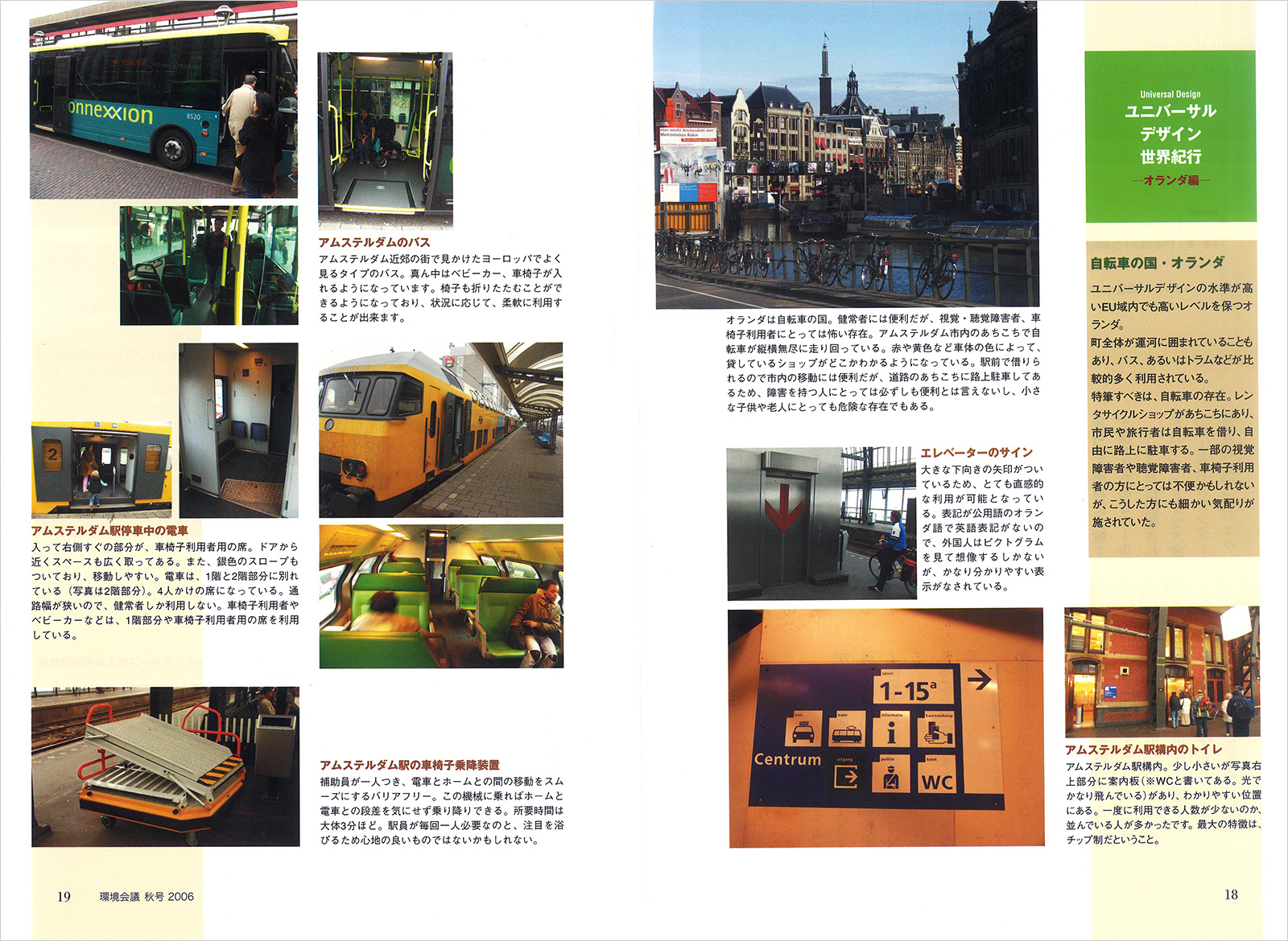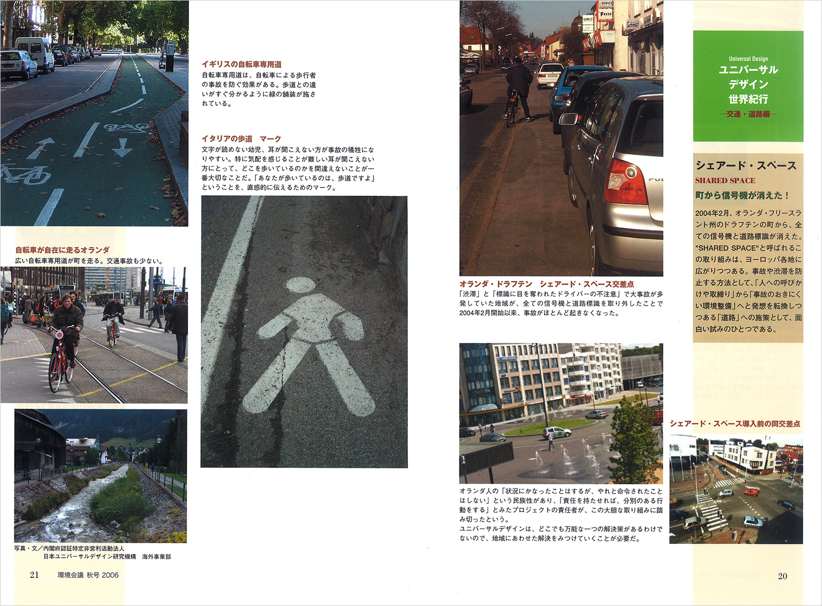 メディア掲載・執筆・出演 【コラム執筆】ユニバーサルデザイン世界紀行<オランダ編、交通・道路編> オランダのユニバーサルデザイン事情についてと、世界の交通・道路のユニバーサルデザインについて執筆しています。 環境会議 2006年秋号(P.18〜21) ユニバーサルデザイン世界紀行<オランダ編、交通・道路編> 出版社:宣伝会議 発行日:2006年9月5日発売 【掲載ページ】P.18 〜P.21 ※クリックすると拡大します。 メディア掲載について 本件のお問合せや、取材のお申込みなどは、実利用者研究機構(ジツケン)までお問合せください。 また、当サイトに掲載されている記事や画像等の無断転載はご遠慮下さい。 →