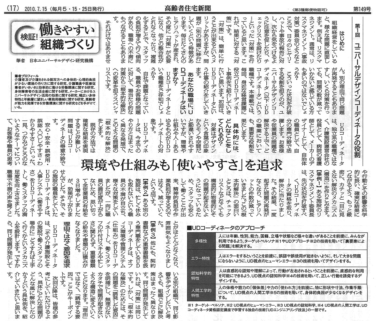 メディア掲載・執筆・出演 【コラム執筆】「第1回 ユニバーサルデザインコーディネータの役割 環境や仕組みも「使いやすさ」を追求」 高齢者住宅新聞の「検証!働きやすい組織づくり」という特集で、当機構がユニバーサルデザインに関わるさまざまなことについて連載しています。 高齢者住宅新聞 2010年7月15日 第149号(17面) 「第1回 ユニバーサルデザインコーディネータの役割 環境や仕組みも「使いやすさ」を追求」 出版社:株式会社 高齢者住宅新聞社 発行日:2010年7月15日発行 関連URL:http://www.koureisha-jutaku.com/ 【掲載ページ】※画像をクリックすると拡大します。 メディア掲載について 本件のお問合せや、取材のお申込みなどは、実利用者研究機構(ジツケン)までお問合せください。 また、当サイトに掲載されている記事や画像等の無断転載はご遠慮下さい。 →