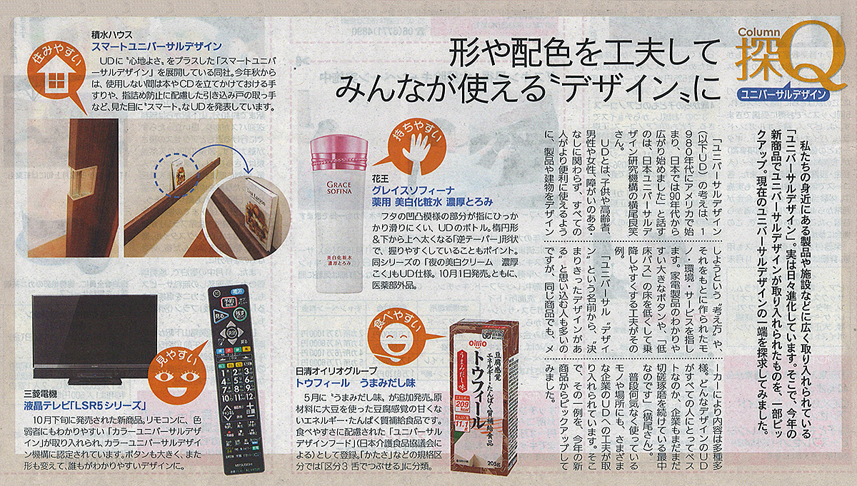 メディア掲載・執筆・出演 【新聞掲載】形や配色を工夫してみんなが使える〝デザイン〟に リビングQ大阪のコラム「探Qユニバーサルデザイン」で、ユニバーサルデザインの考え方について、横尾理事長が寄稿しています。 リビングQ大阪 2013年紅葉号(11面) 形や配色を工夫してみんなが使える〝デザイン〟に 出版社:サイケンリビング新聞社 発行日:20013年10月31日発行 【掲載ページ】※画像をクリックすると拡大します。 メディア掲載について 本件のお問合せや、取材のお申込みなどは、実利用者研究機構(ジツケン)までお問合せください。 また、当サイトに掲載されている記事や画像等の無断転載はご遠慮下さい。 →