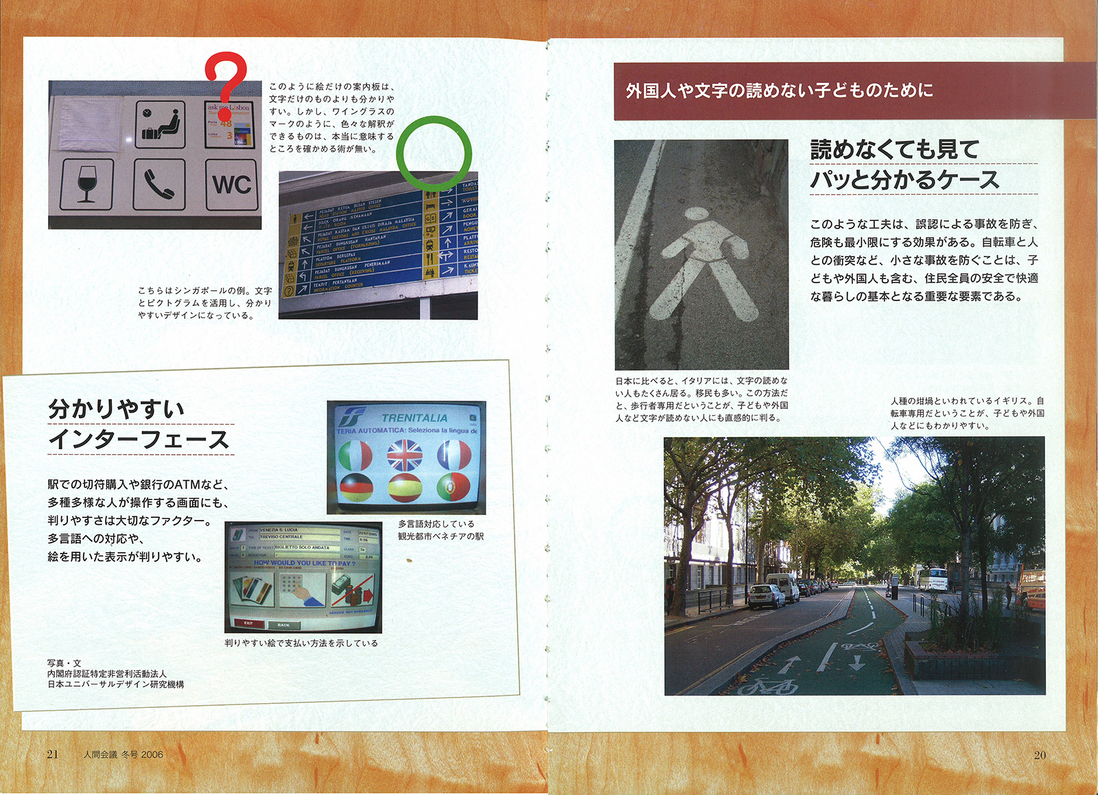 外国人や、文字の読めない子どもたちのために、イタリアの歩行者マークや、シンガポールの空港のピクトグラムなど、パッとみてわかることで誤認による事故をふせぎ、危険を最小限にする効果があることを紹介。