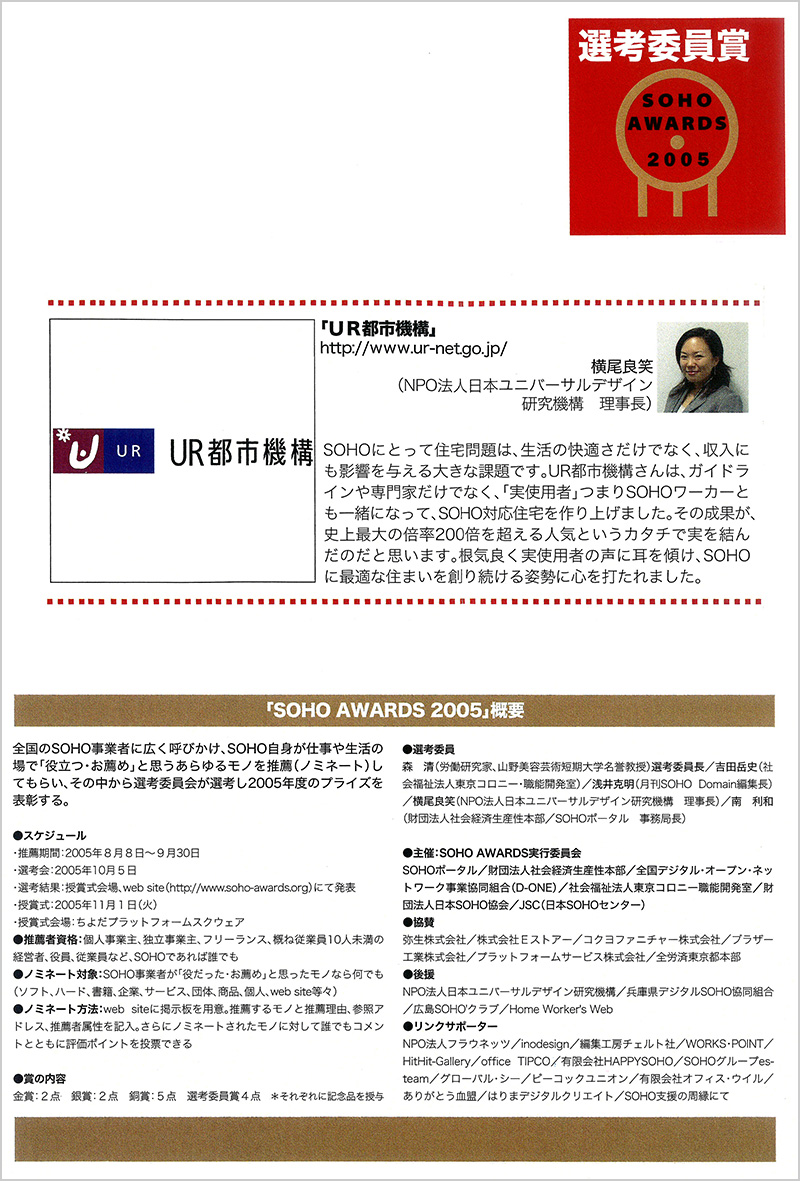 メディア掲載・執筆・出演 【審査委員】SOHO AWARDS「2005」 横尾理事長が、SOHO AWARDS「2005」の選考委員に選出され、選考委員賞として「UR都市機構」を評価しています。 SOHO AWARDS「2005」 「選考委員長賞 UR都市機構」 出版社:SOHO AWARDS実行委員会 発行日:2005年11月1日発行 関連URL:http://soho-awards.org/ ※現在は公開されていません 【掲載ページ】※クリックすると拡大されます